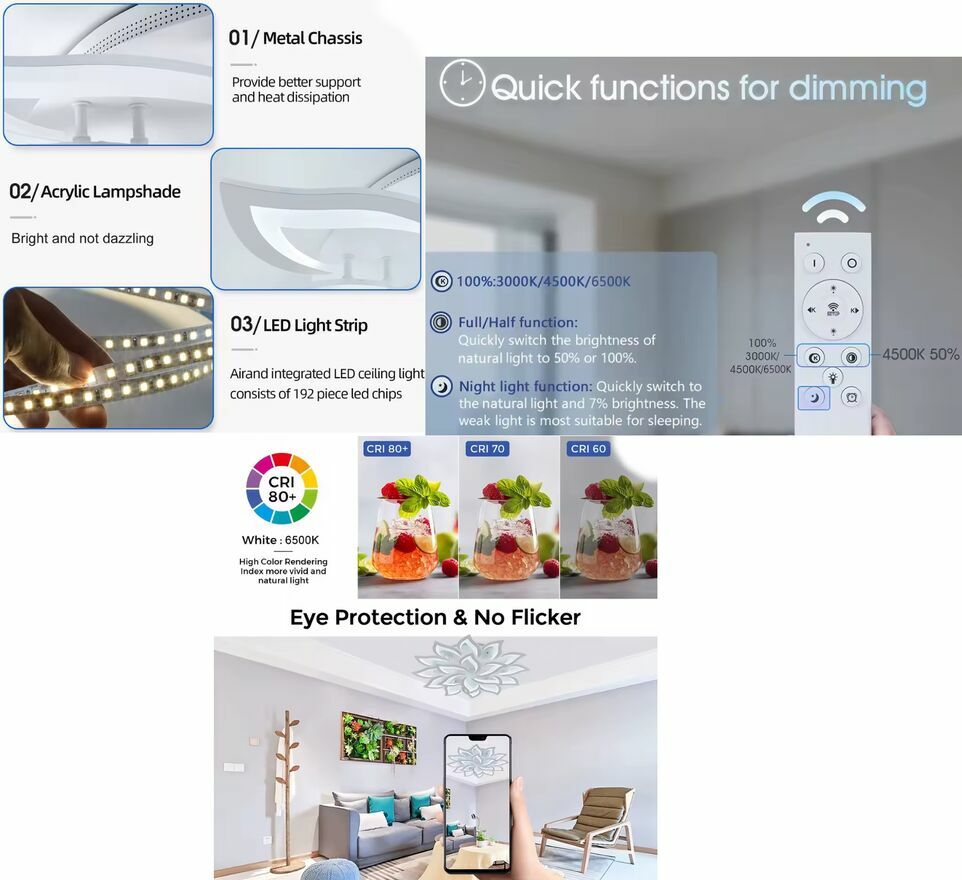 Możliwość ściemniania jasności pilotem lub komórką z aplikacją z funkcją ściemniania RC. Dobre światło rozproszone do salonu, biura, sypialni