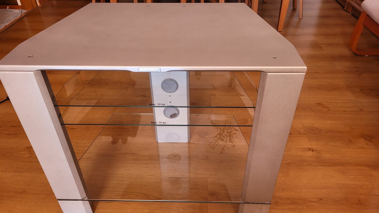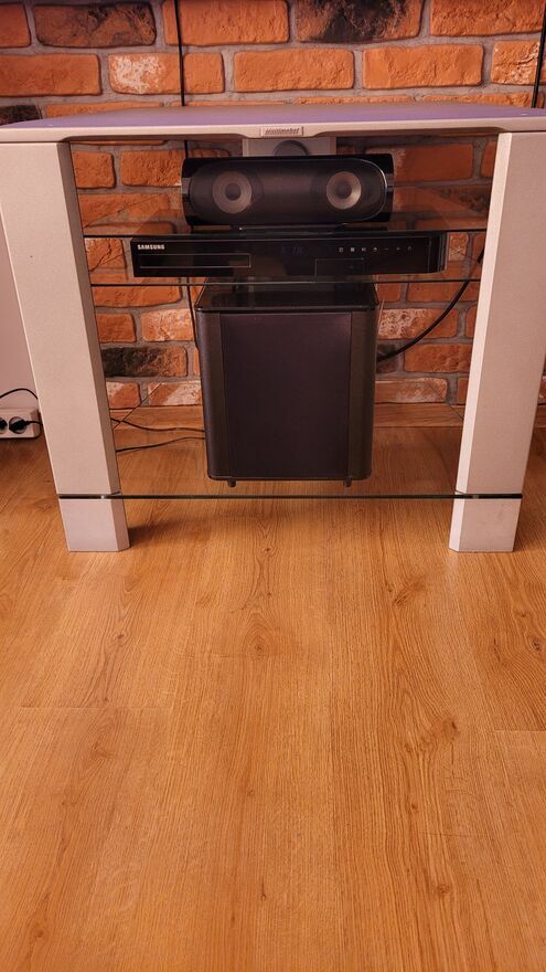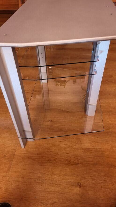 Do sprzedania stolik pod telewizor z 3 półkami z hartowanego szkła, można dowolnie przestawiać dopasowując do multimediów. O nośności 15 kg w kolorze srebrnym.Wymiary: