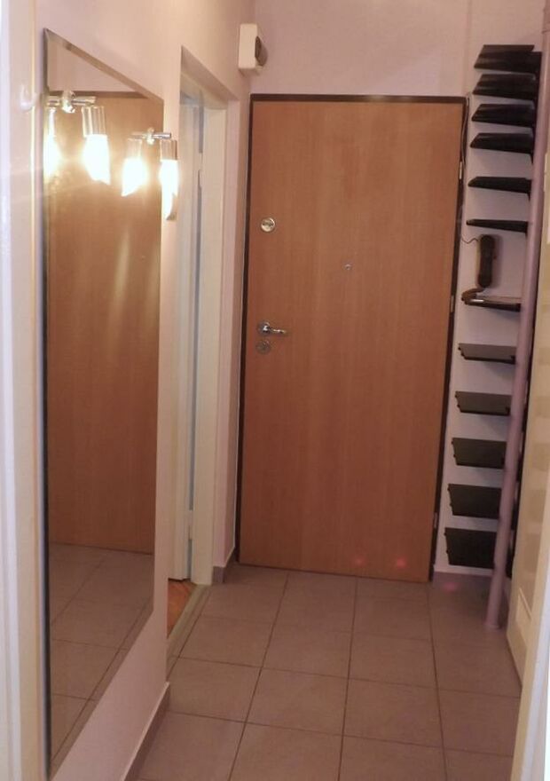 Przedpokój: szafki, lustro.